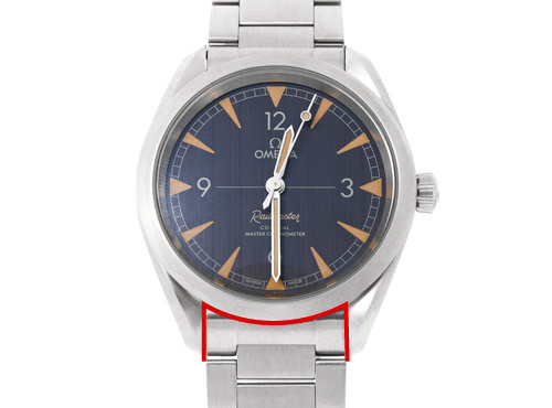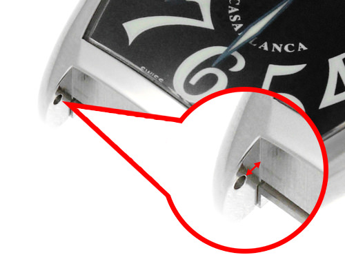 画像のように、ケースとラグ穴間に距離がない場合、お好きなベルトの取り付けができない場合がございます。ベルトの厚みが収まりきらない可能性もあるためです。