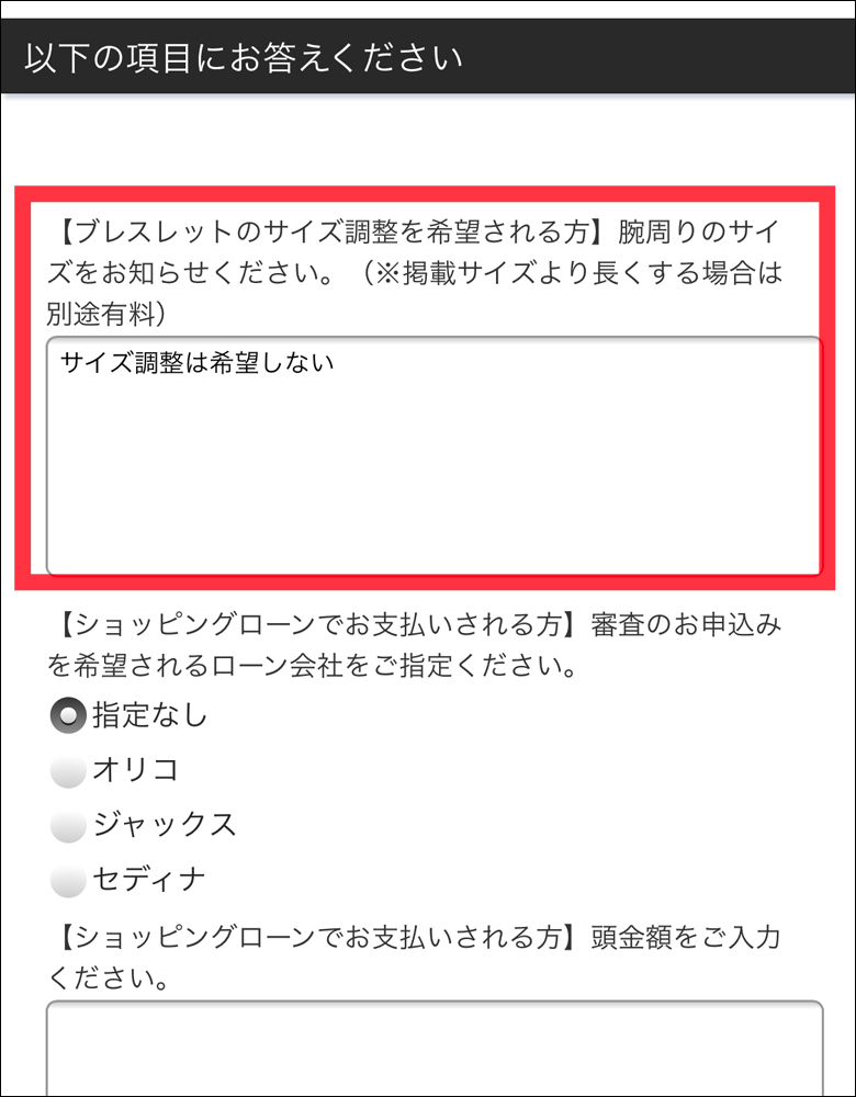 購入者情報記入時にブレスサイズ調整の記載欄がございますので、サイズ調整を「希望する」「希望しない」選択してください。